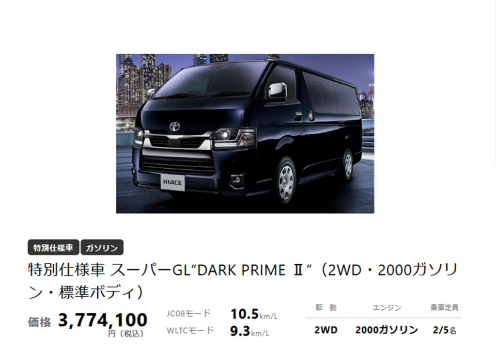 ダークプライムSは、 ハイエースの20周年を記念して設定された特別仕様車です。